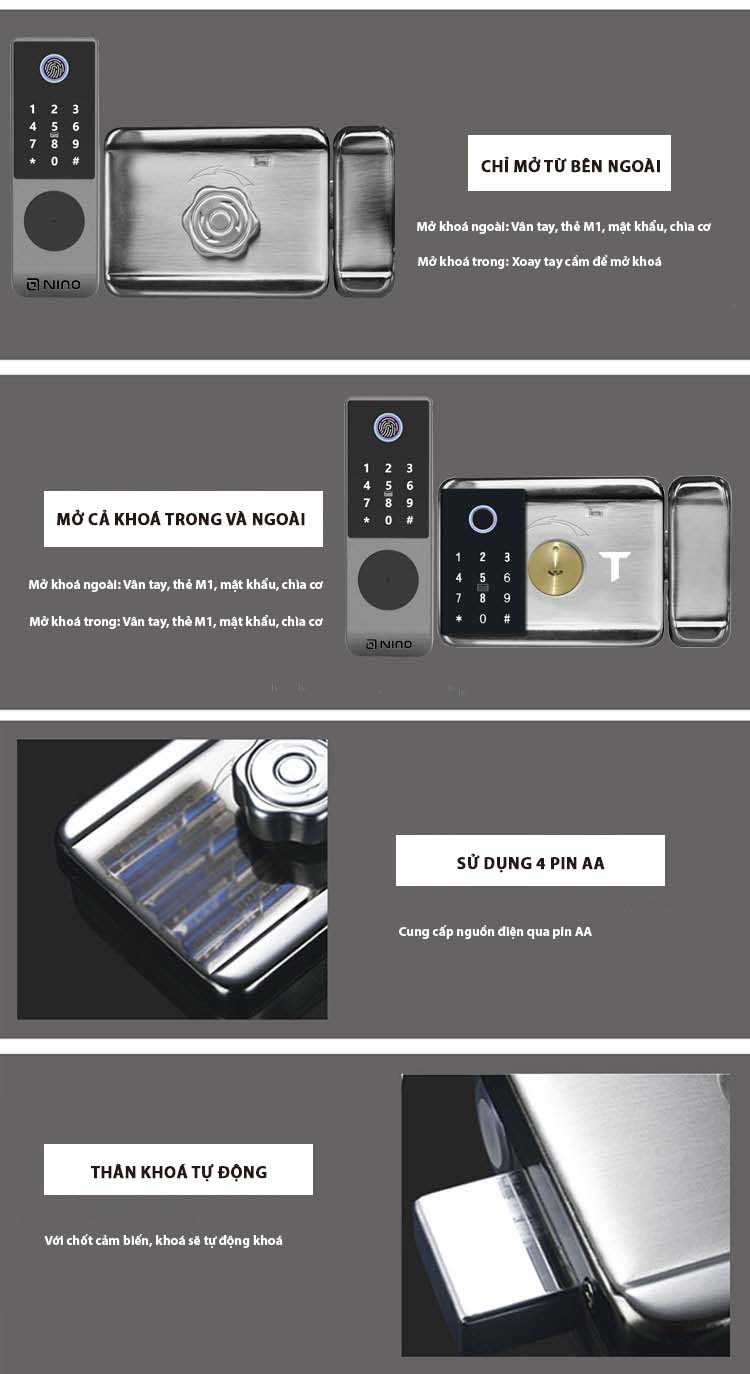 • Vân tay 2 mặt, thẻ 2 mặt, mật khẩu 2 mặt, chìa cơ 2 mặt và app 2 mặt